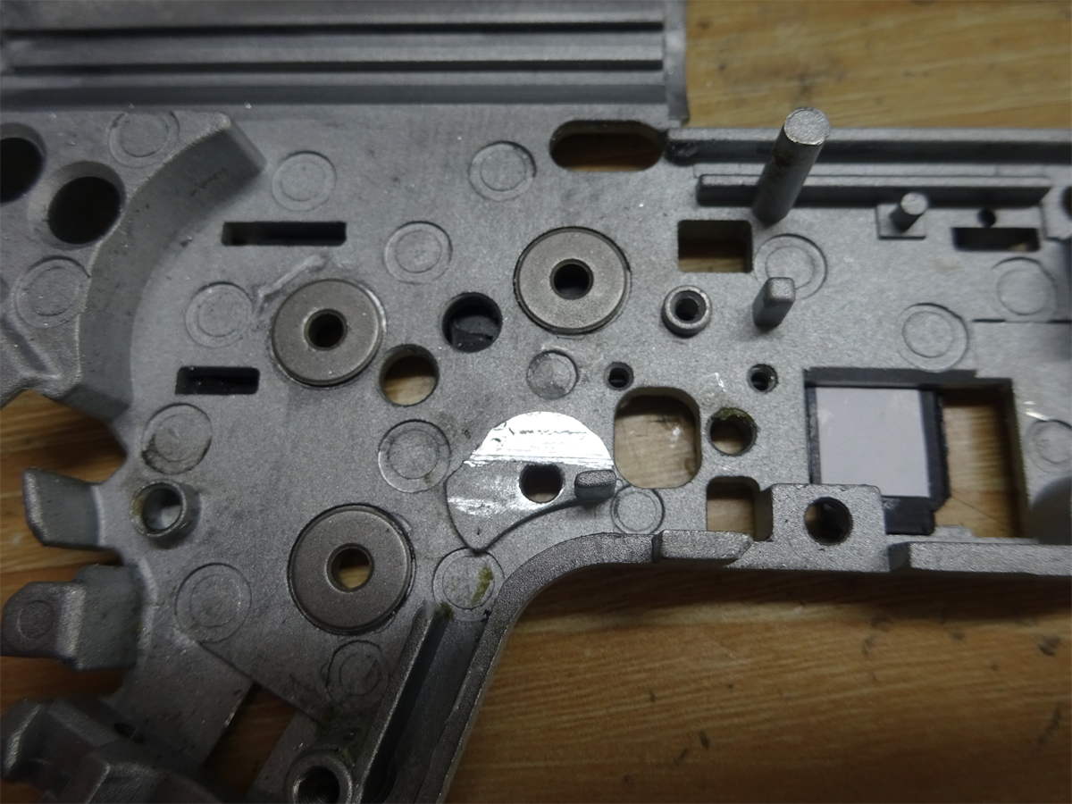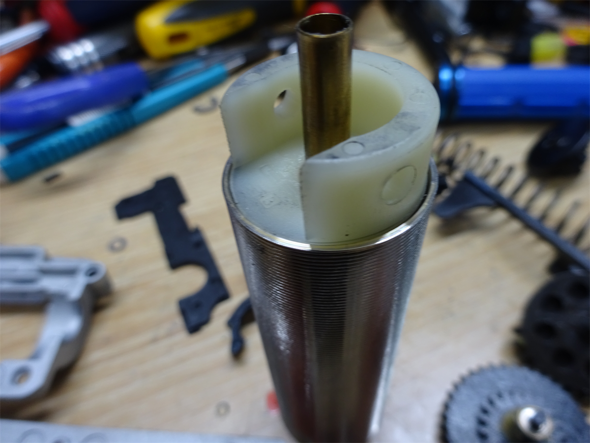 そのままだと、シリンダーヘッドより出ている場合があり、そうなるとタペットプレートの最大後退量の妨げになり、給弾不良の原因となります。