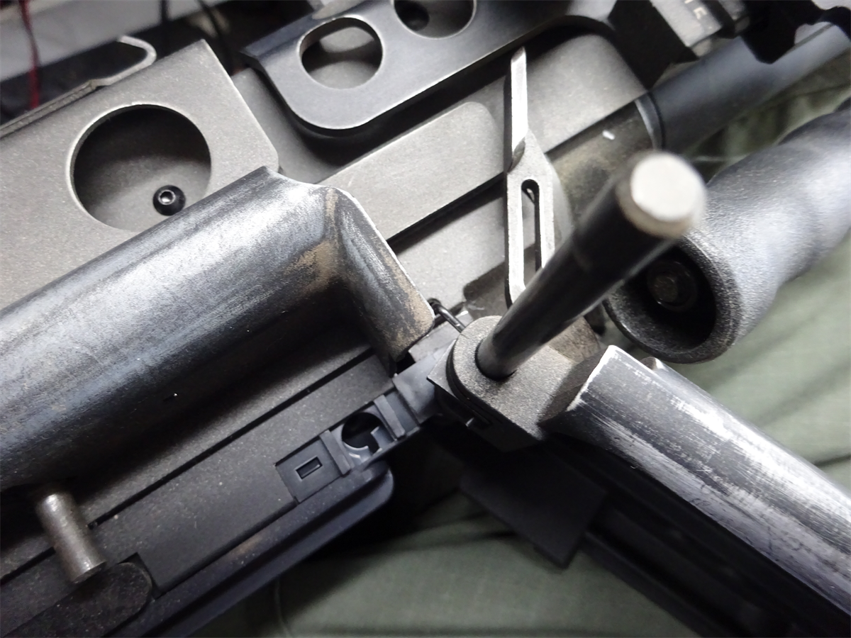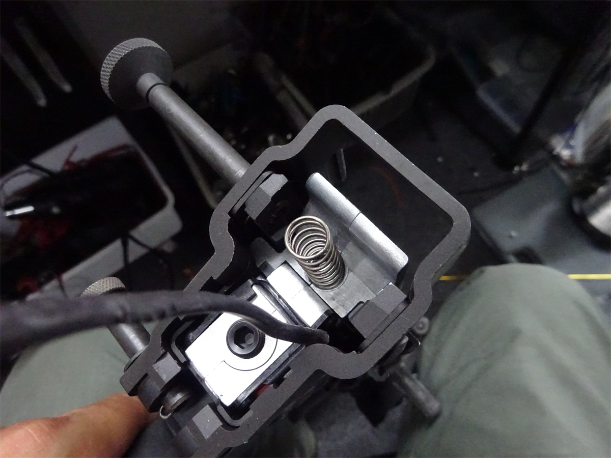 このピンを抜くと外れるのですが、完全に抜いてしまうと、スプリング等が飛んでいくので、抜ききらない方が良いです。