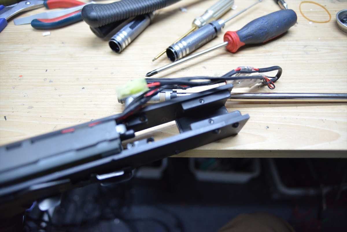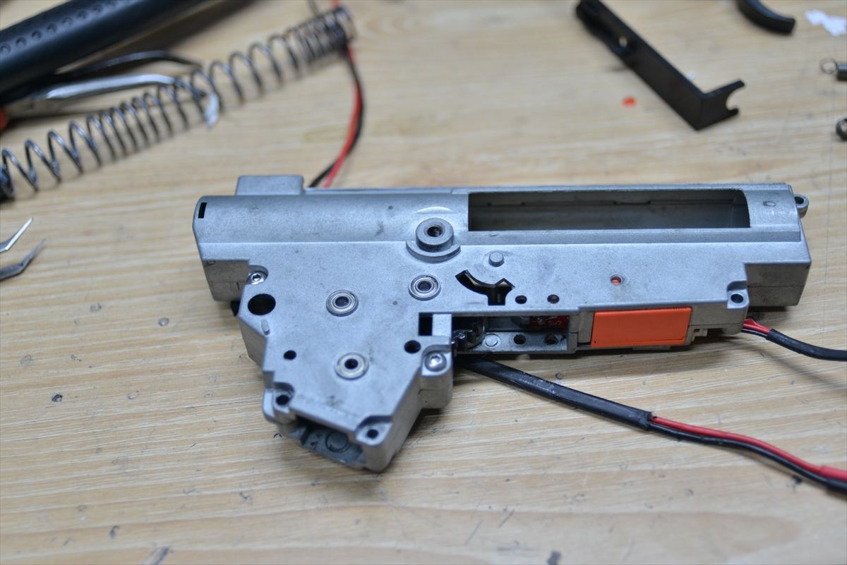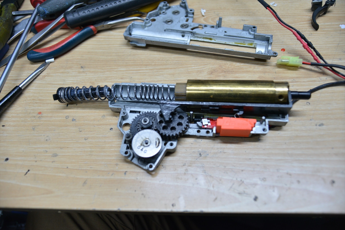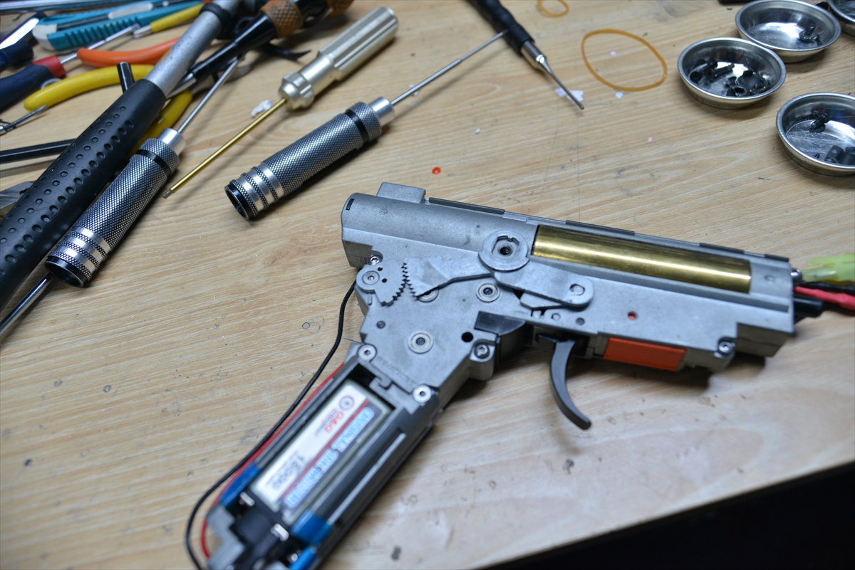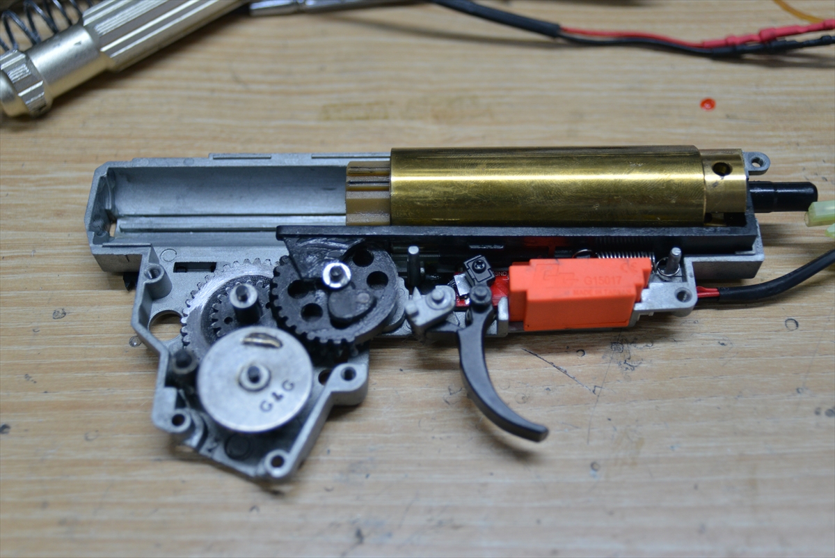 G&G系のCM系メカボックスは、ネジ締めると圧が変わるので、2本締めて調整します。