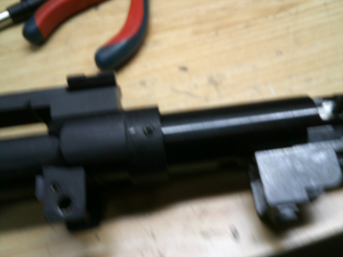 銃身がとれるので、バレルを止めている左右のイモネジを外すと、バレルが前方に抜けます。