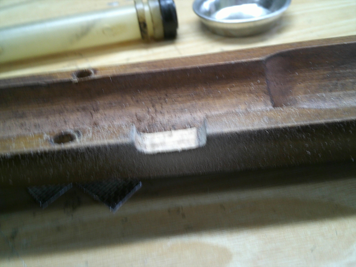 成型が悪く、ホップアームが上部のウッドに接触して変な形でホップが効いているので、削って当たらないようにします。