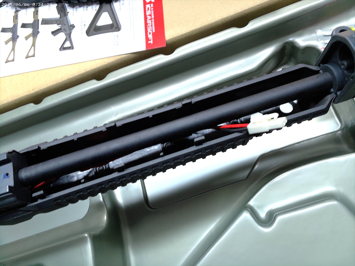 ハンドガードは上下分割式で、ここにバッテリーが収納されます。
