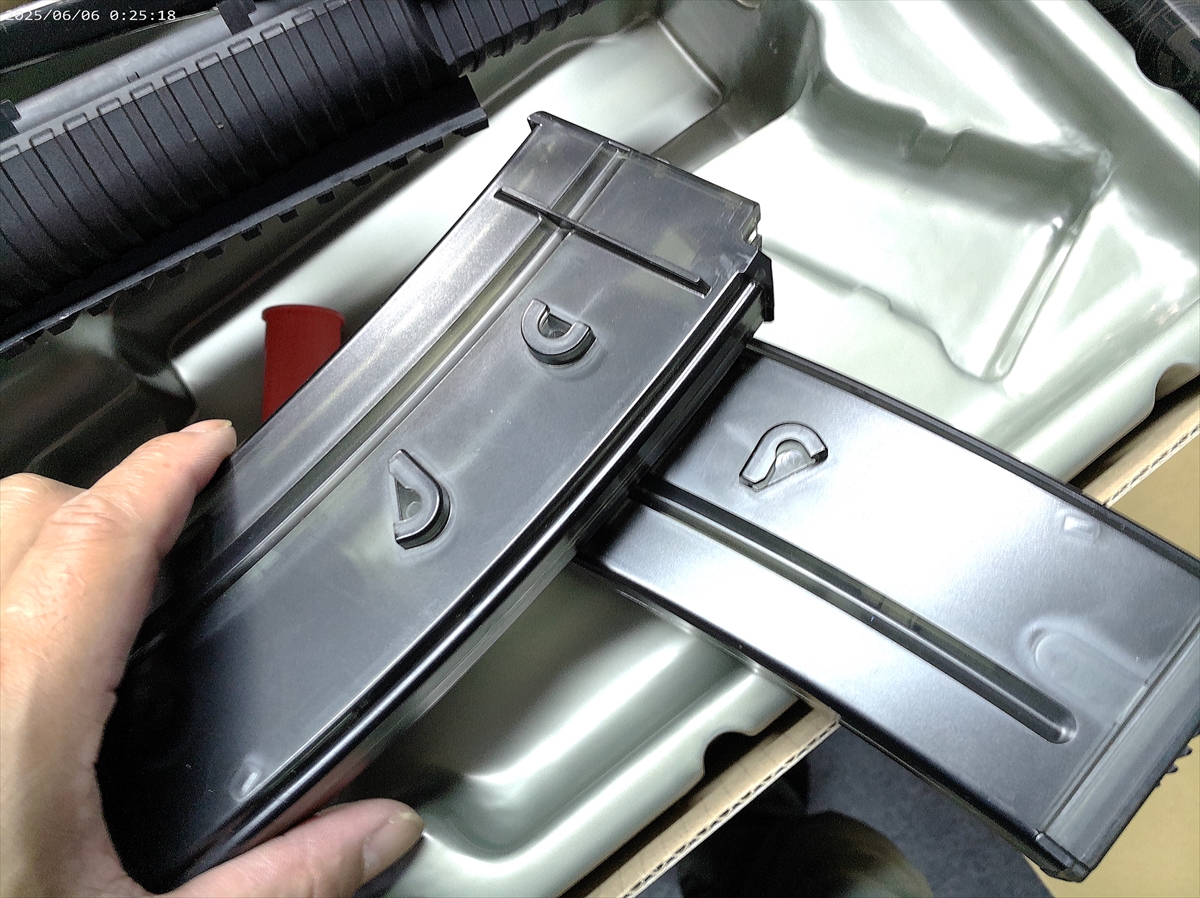 マガジンは多弾マガジンが2個附属しており、実銃同様連結可能です。