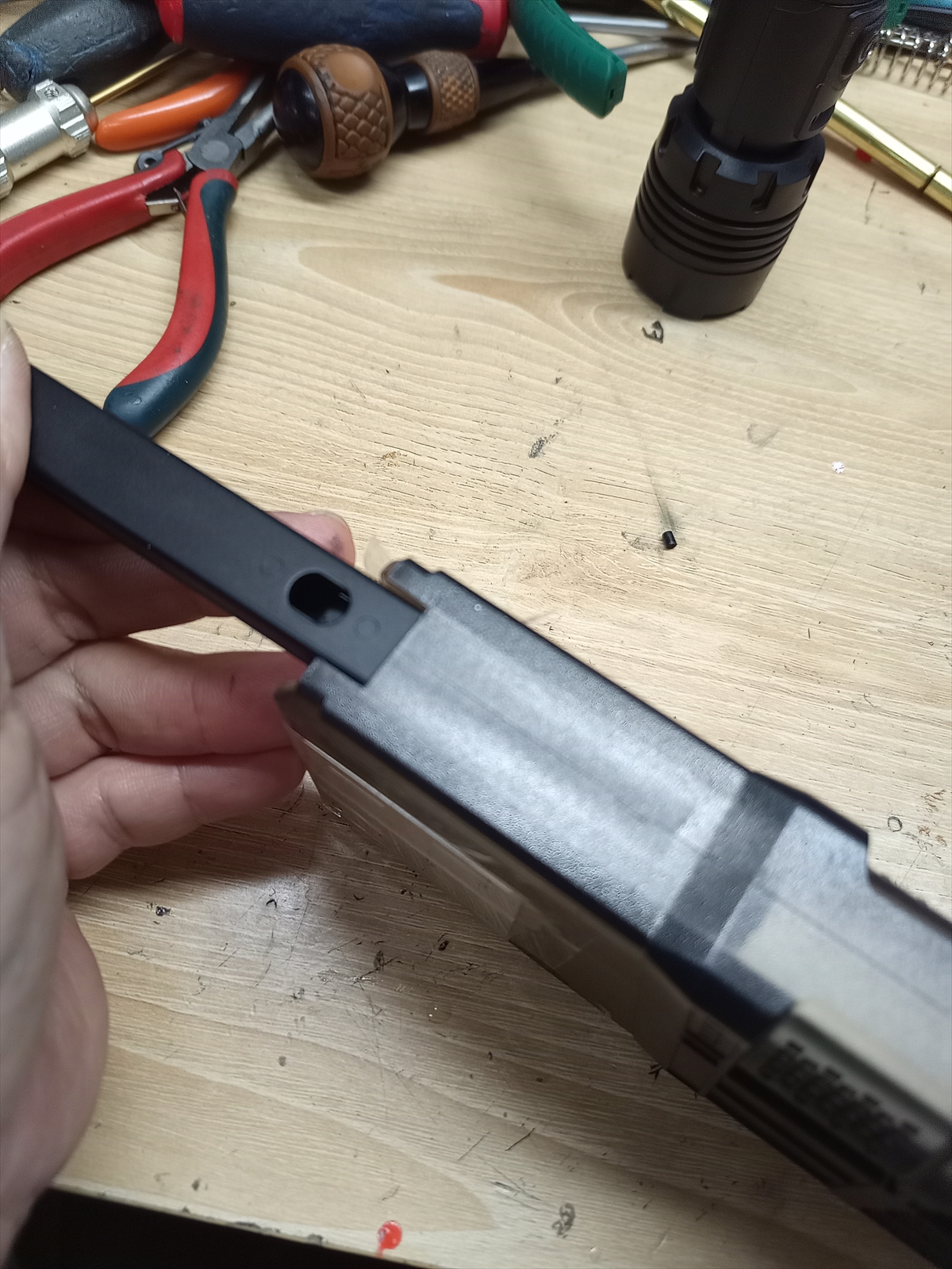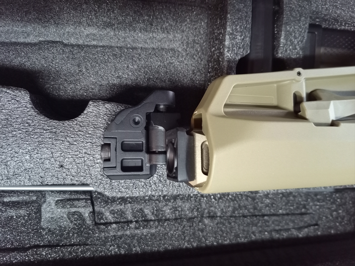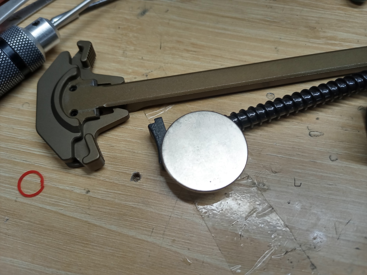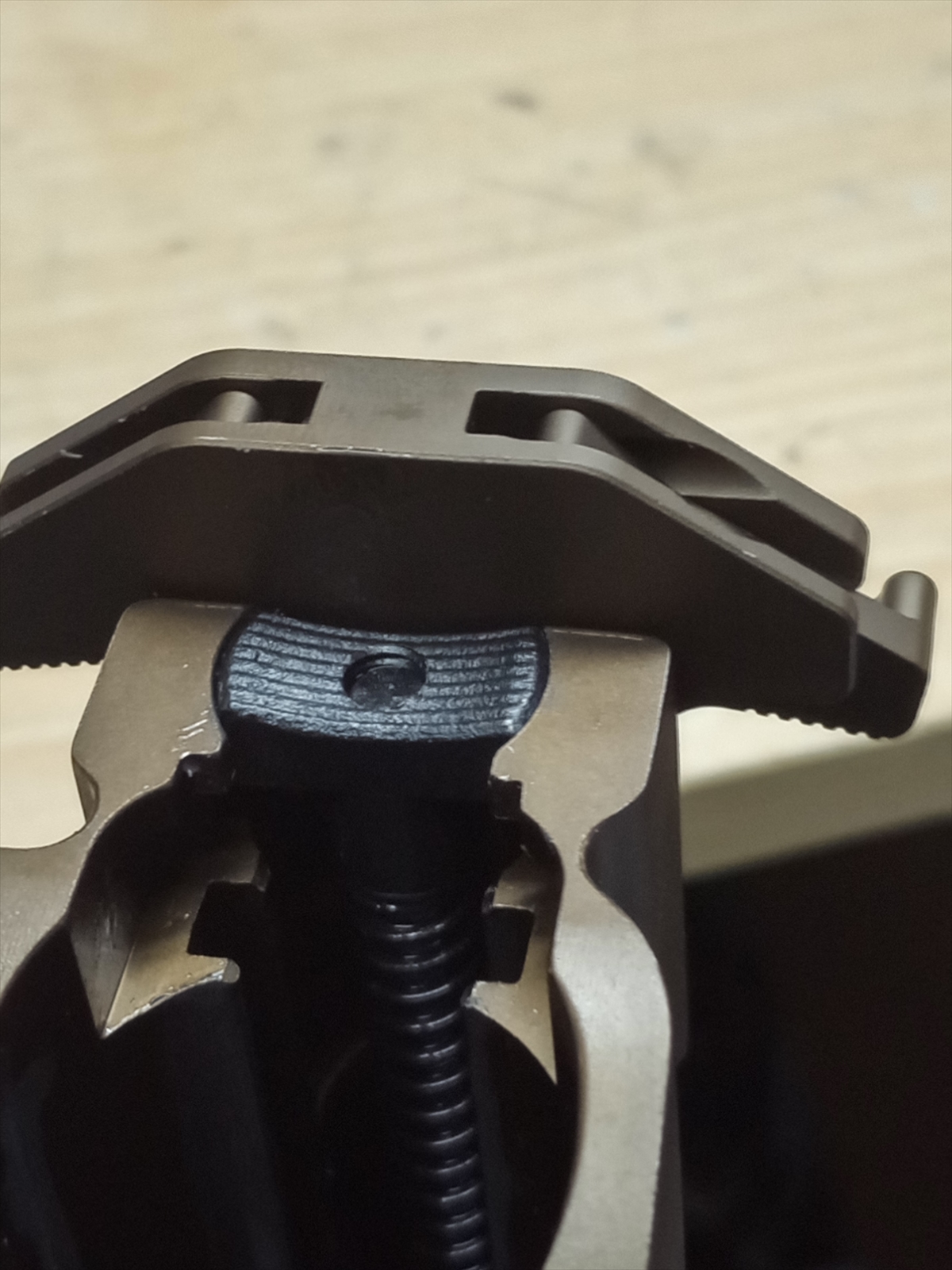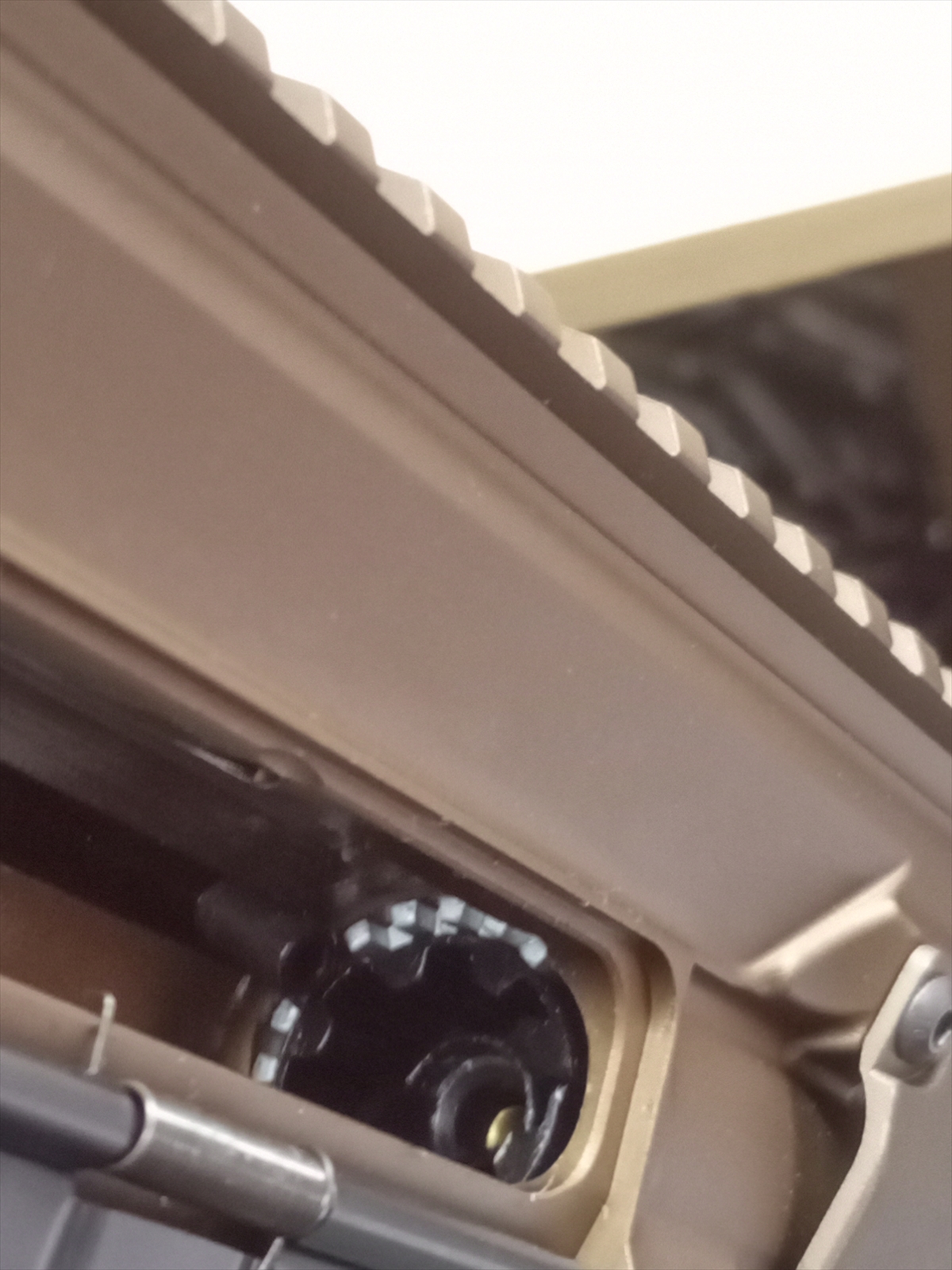 ボルトガイドは、90度の位置で押し込んで戻す感じでロックがかかるので、テイクダウンで飛び出すことはないです。