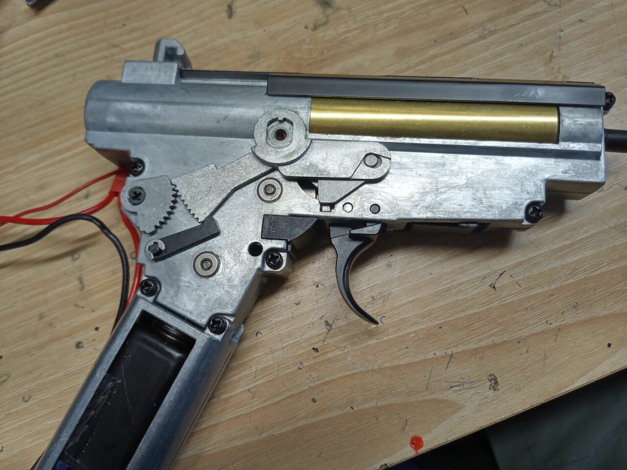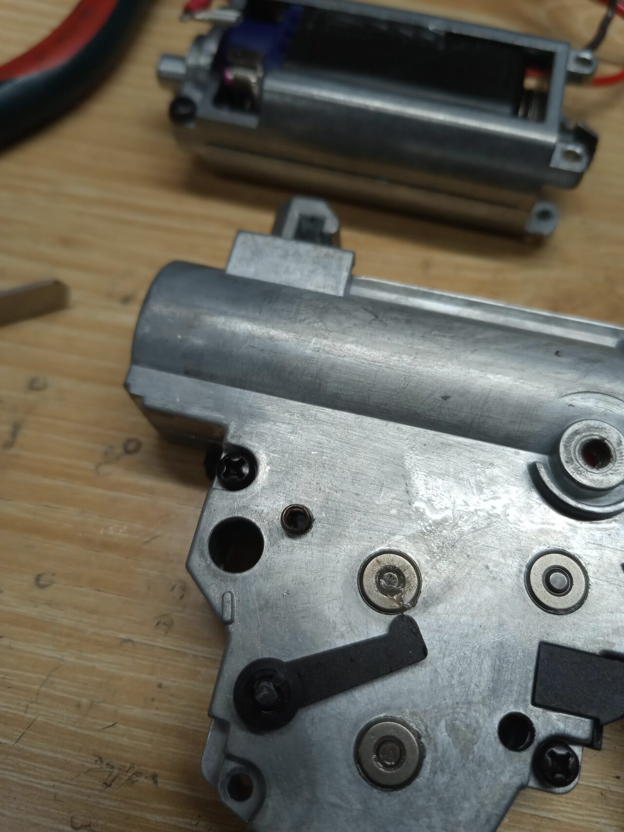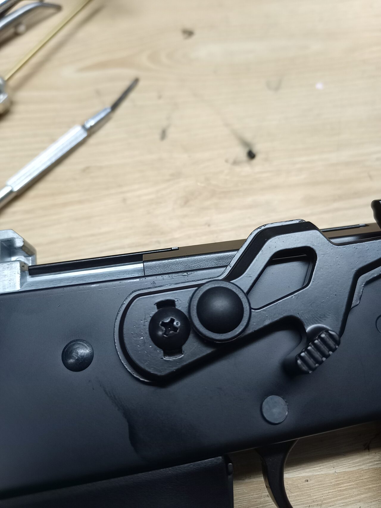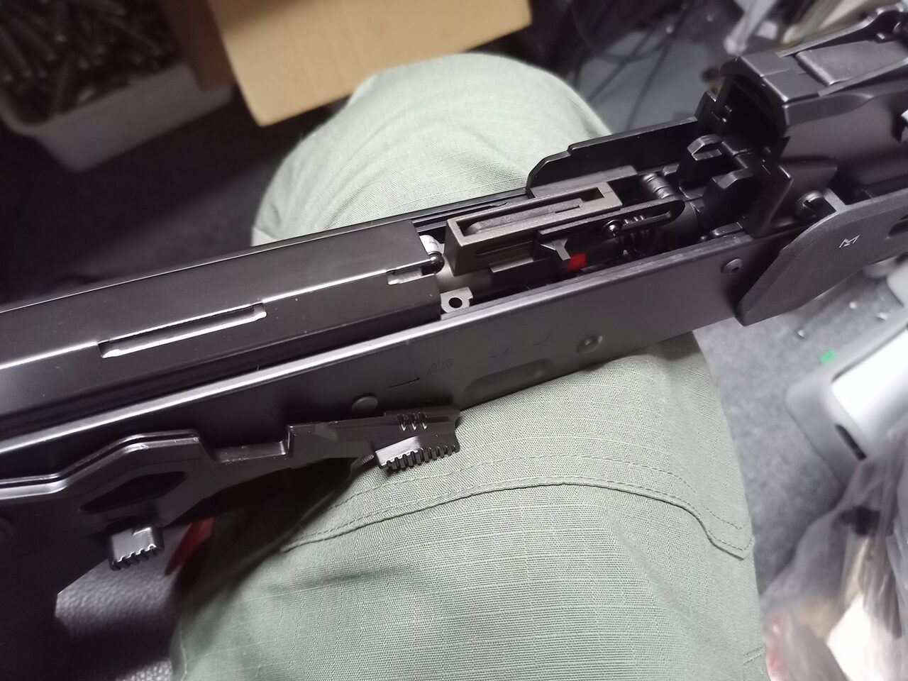とあるメーカーだと、トリガー周り、ラッチ、タペットが押さえてないと外れるのがあります。