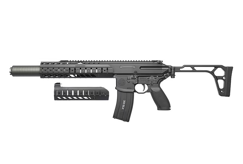 技術的特徴として、.300 AAC Blackout弾の採用。この弾丸は、亜音速弾を使用すればサプレッサー併用時に驚異的な静粛性を発揮し、AK-47に近い打撃力を得られる柔軟性を持ちます。銃身は6.75インチという極めて短いバレルを採用し、専用の幅広なハンドガード(ALTRDタイプ)内にサプレッサーを半分ほど飲み込ませる独特のスタイルが外見上の大きな特徴です。