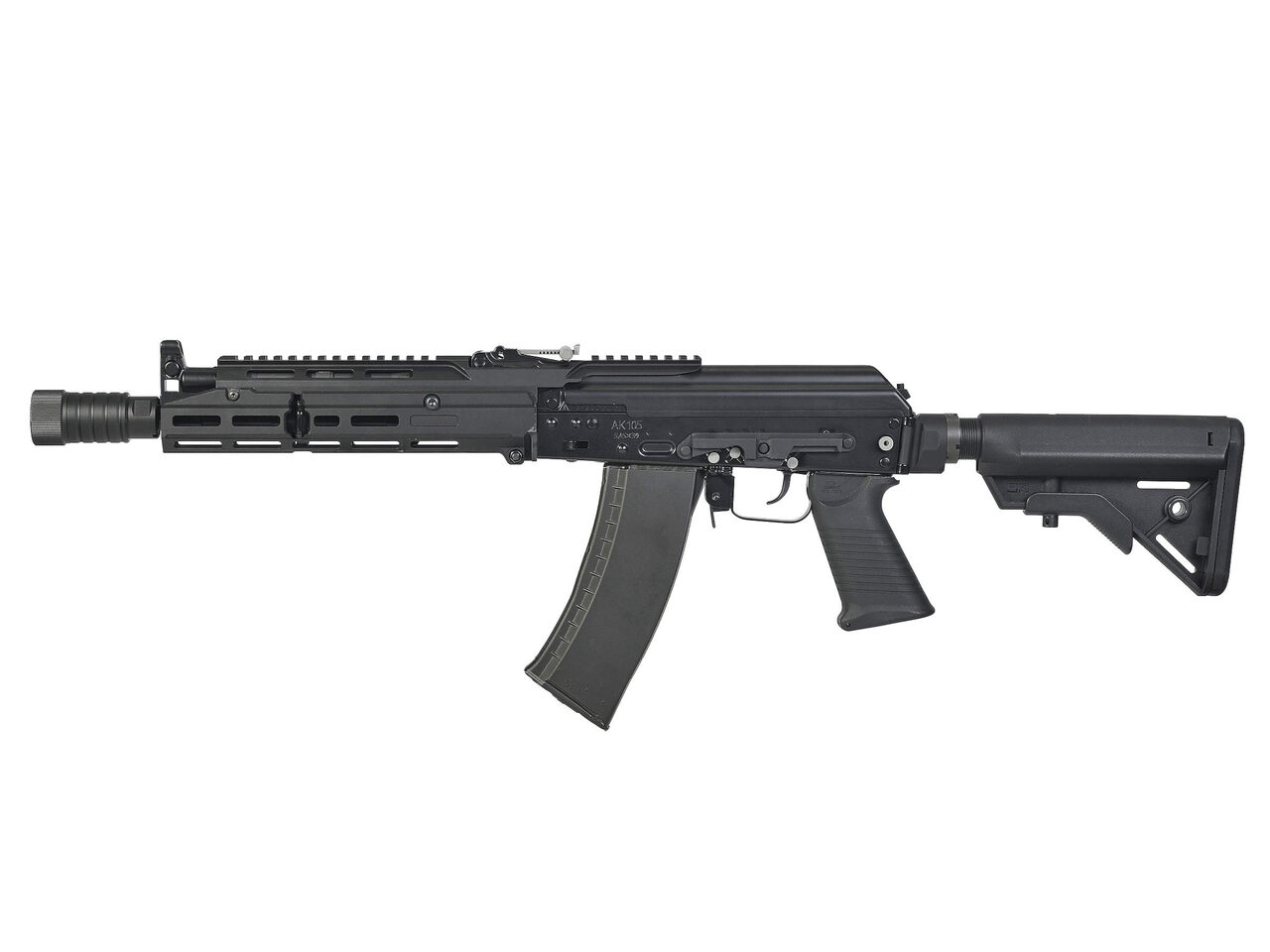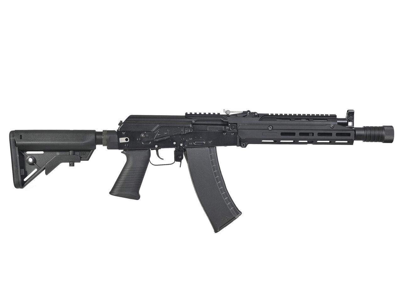 Black semi-automatic rifle with collapsible stock and curved magazine shown from side.