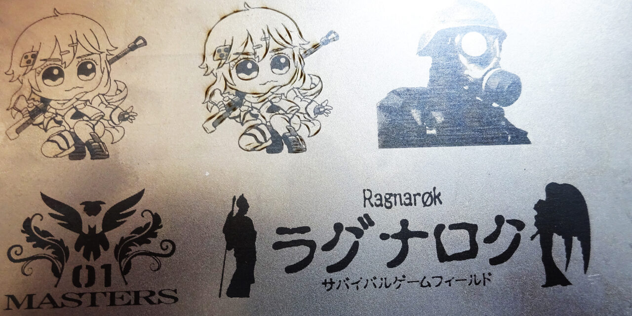 高出力レーザーで、金属・木材・ガラス・布物などに、文字やイラストなどを掘る作業です。